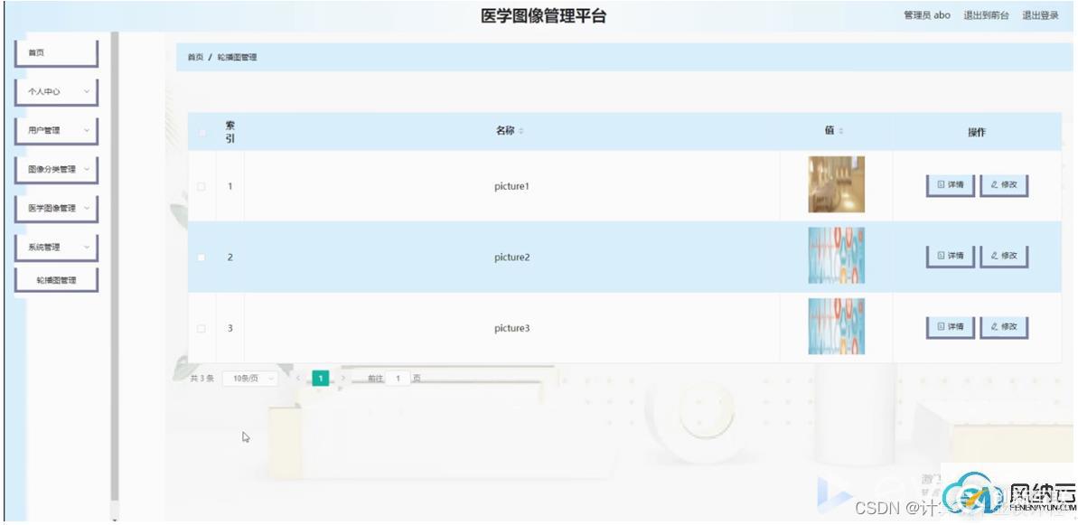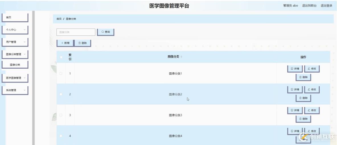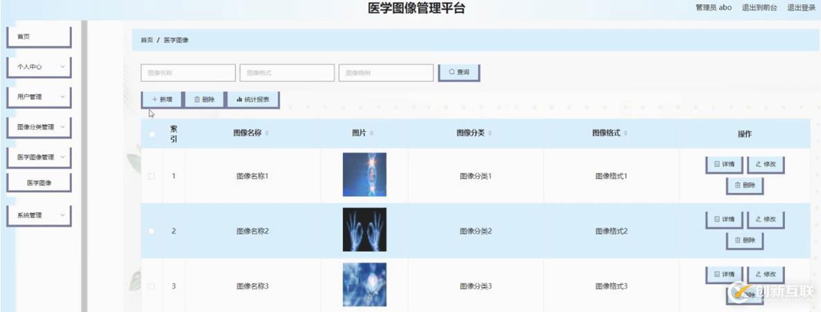 醫(yī)學圖像管理,在醫(yī)學圖像管理頁面可以對索引,圖像名稱,圖片,圖像分類,圖像格式等內(nèi)容進行詳情,修改或刪除等操作,如圖5-9所示。