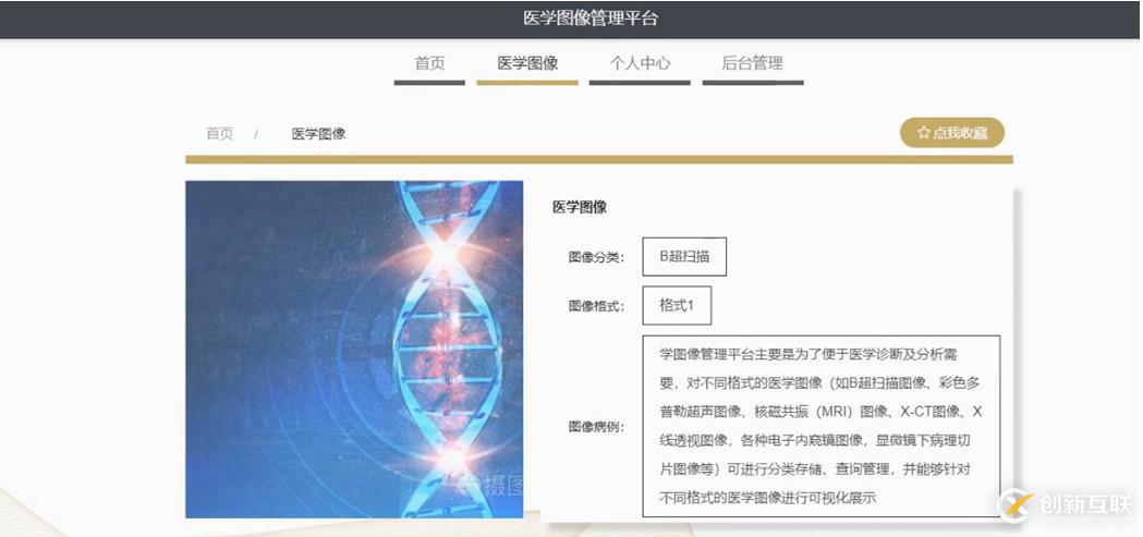 醫(yī)學圖像,在醫(yī)學圖像頁面可以查看圖像名稱,圖像分類,圖像格式,圖像病例,圖片,圖像詳情等內(nèi)容;并進行收藏操作,如圖5-3所示。