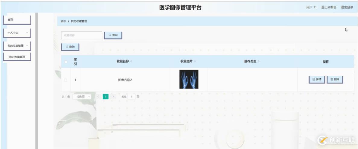 我的收藏管理,在我的收藏管理頁面可以對索引,收藏名稱,收藏圖片,推薦類型等內(nèi)容進行詳情和刪除等操作,如圖5-12所示。