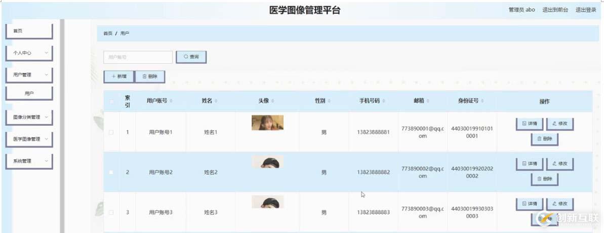 用戶管理,在用戶管理頁面可以對索引,用戶賬戶,姓名,頭像,性別,手機號碼, 郵箱,身份證號等內(nèi)容進行詳情,修改或刪除等操作,如圖5-7所示。