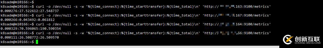 curl -o /dev/null -s -w '%{time_connect}:%{time_starttransfer}:%{time_total}\n' 'http://NodeIP:9100/metrics'time_connect :連接時(shí)間,從開始到TCP三次握手完成時(shí)間,這里面包括DNS解析的時(shí)候,如果想求連接時(shí)間,需要減去上面的解析時(shí)間;