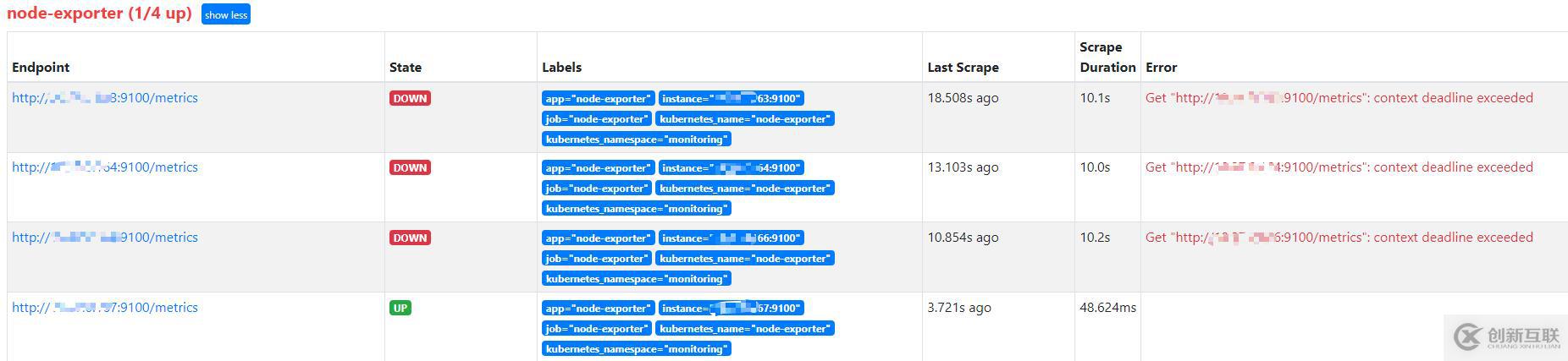 公司網(wǎng)絡(luò)更改重啟服務(wù)器后,發(fā)現(xiàn)Prometheus監(jiān)控中node節(jié)點(diǎn)三個(gè)掛掉了,實(shí)際上節(jié)點(diǎn)服務(wù)器是正常的,但是監(jiān)控的node_exporter請求http://IP:9100/metrics超過10秒沒有獲取返回?cái)?shù)據(jù)則認(rèn)為服務(wù)掛掉。