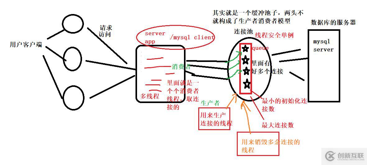 通過預(yù)先創(chuàng)建一定數(shù)量的連接,放到一個(gè)池子。當(dāng)客戶端有請求時(shí),服務(wù)器端需要與mysql進(jìn)行交互,那么只需要從池子里取出一個(gè)連接,當(dāng)操作完成再將連接放到連接池中。如此以來避免了頻繁的創(chuàng)建和銷毀線程。