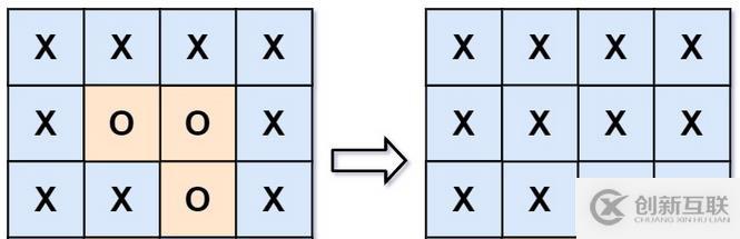 給你一個m x n的矩陣board,由若干字符'X'和'O',找到所有被'X'圍繞的區(qū)域,并將這些區(qū)域里所有的?'O'用'X'填充。