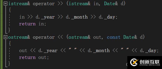 文本讀寫(xiě)時(shí)ServerInfo可以使用string類(lèi),因?yàn)閟tring類(lèi)中有istream版本的operator>>和ostream版本的operator<<運(yùn)算符重載函數(shù),在下圖一的代碼中調(diào)用的是string類(lèi)中重載的istream版本的operator>>和ostream版本的operator<<,里面是將string類(lèi)中指針指向字符串內(nèi)容進(jìn)行讀取和寫(xiě)入操作。我們自定義的Date類(lèi)就是像上面這種方式定義了自己的istream版本的operator>>和ostream版本的operator<<運(yùn)算符重載函數(shù),如下圖二所示。