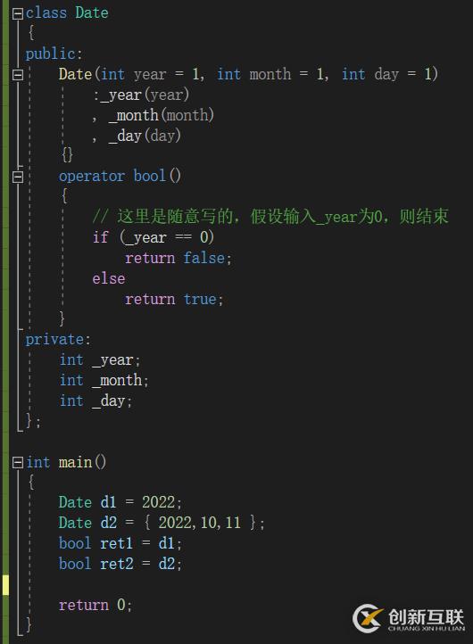 c++給了一種語(yǔ)法,可以支持自定義類(lèi)型的隱式類(lèi)型轉(zhuǎn)換,將自定義類(lèi)型轉(zhuǎn)換成內(nèi)置類(lèi)型,如下面的代碼所示,使用operator bool函數(shù)可以將Date自定義類(lèi)型轉(zhuǎn)換成bool類(lèi)型,轉(zhuǎn)換方式在operator bool函數(shù)中自己實(shí)現(xiàn)。
