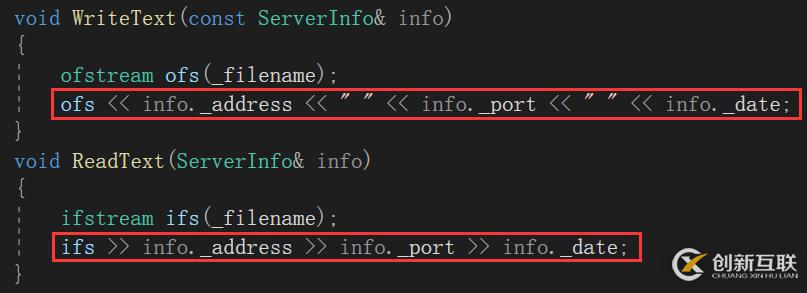 4.ReadText中使用operator>>運(yùn)算符重載函數(shù)讀取的時(shí)候是以空格或換行符為間隔進(jìn)行讀取的,因此WriteText中每次寫(xiě)入一個(gè)對(duì)象時(shí)后面都需要寫(xiě)入空格或換行符與后面的對(duì)象隔開(kāi),如下圖所示。