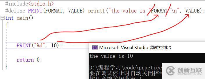 這里的宏參數(shù)為“%d”和10,分別替換FORMAT 和 VALUE,其中FORMAT在傳參時(shí)必須傳入帶有“”的參數(shù),否則便不能輸出。