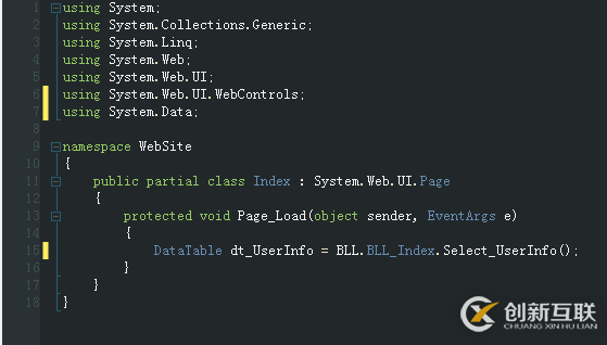 3. 既然BLL中能夠查詢數(shù)據(jù)庫,返回DataTable表,那么我在UIL層中接受DataTable,那么即可獲取到數(shù)據(jù)庫中相應(yīng)的數(shù)據(jù)了。的確如此,我們在頁面的后臺代碼Index.aspx.cs中編碼接收Datatable的傳值。