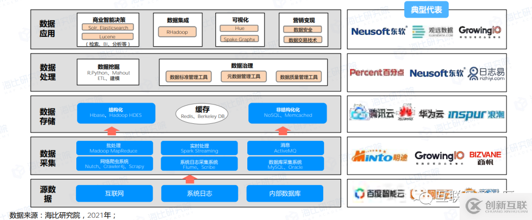 數(shù)據(jù)資產(chǎn)化的技術(shù)架構(gòu)分為五個層級,底層是源數(shù)據(jù),主要有互聯(lián)網(wǎng)數(shù)據(jù)、系統(tǒng)日志數(shù)據(jù)和內(nèi)部數(shù)據(jù)庫;第二層則是數(shù)據(jù)采集環(huán)節(jié),主要針對三大源數(shù)據(jù)有不同采集技術(shù);第三層是存儲環(huán)節(jié),包括結(jié)構(gòu)化數(shù)據(jù)存儲和非結(jié)構(gòu)化數(shù)據(jù)存儲技術(shù);第四層則是數(shù)據(jù)處理技術(shù),主要有數(shù)據(jù)挖掘技術(shù)和 數(shù)據(jù)治理技術(shù)構(gòu)成;第五層則是數(shù)據(jù)應(yīng)用技術(shù),包括商業(yè)智能分析、數(shù)據(jù)集成、可視化、營銷變現(xiàn)等相關(guān)技術(shù)。