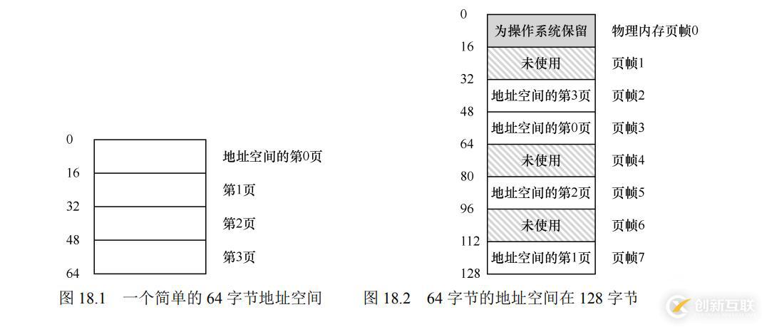 圖 18.2 展示了對應(yīng)的物理內(nèi)存,由一組固定大小的槽塊組成。在這個例子中,有 8 個頁幀(由 128 字節(jié)物理內(nèi)存構(gòu)成,也是極小的)。從圖中可以看出,虛擬地址空間的頁放在物理內(nèi)存的不同位置。圖中還顯示,操作系統(tǒng)自己用了一些物理內(nèi)存。
