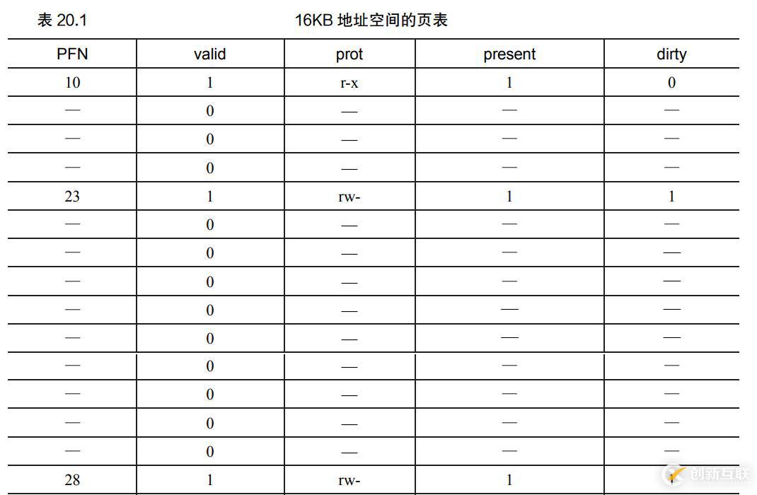 這個例子假定單個代碼頁(VPN 0)映射到物理 頁 10,單個堆頁(VPN 4)映射到物理頁 23,以及 地址空間另一端的兩個棧頁(VPN 14 和 15)被分別 映射到物理頁 28 和 4。從圖 20.1 中可以看到,大部 分頁表都沒有使用,充滿了無效的(invalid)項(xiàng),十分浪費(fèi)。
