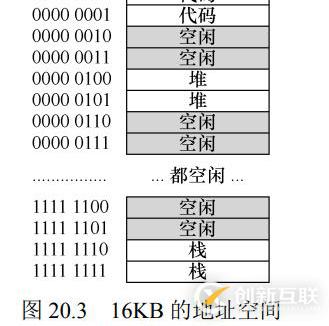 3.2 混合方法:分頁和分段 3.2.1 雜合方式的原理假設(shè)我們有一個地址空間,其中 堆和棧的使用部分很小。例如,我們使用一個 16KB 的小地址空間和 1KB 的頁(見圖 20.1)。該地址空間的頁表如表 20.1 所示。