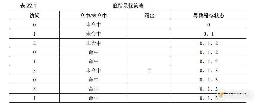 假設(shè)一個程序按照以下順序訪問 虛擬頁:0,1,2,0,1,3,0,3,1,2,1。表 22.1 展示了最優(yōu)的策略,這里假設(shè)緩存可以存 3 個頁。