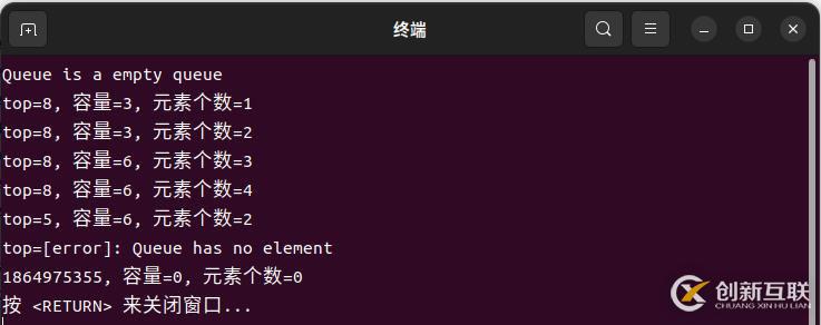 cout<< "top="<< Queue.top()<< ", 容量="<< Queue.capciaty()<< ", 元素個(gè)數(shù)="<< Queue.size()<< endl;