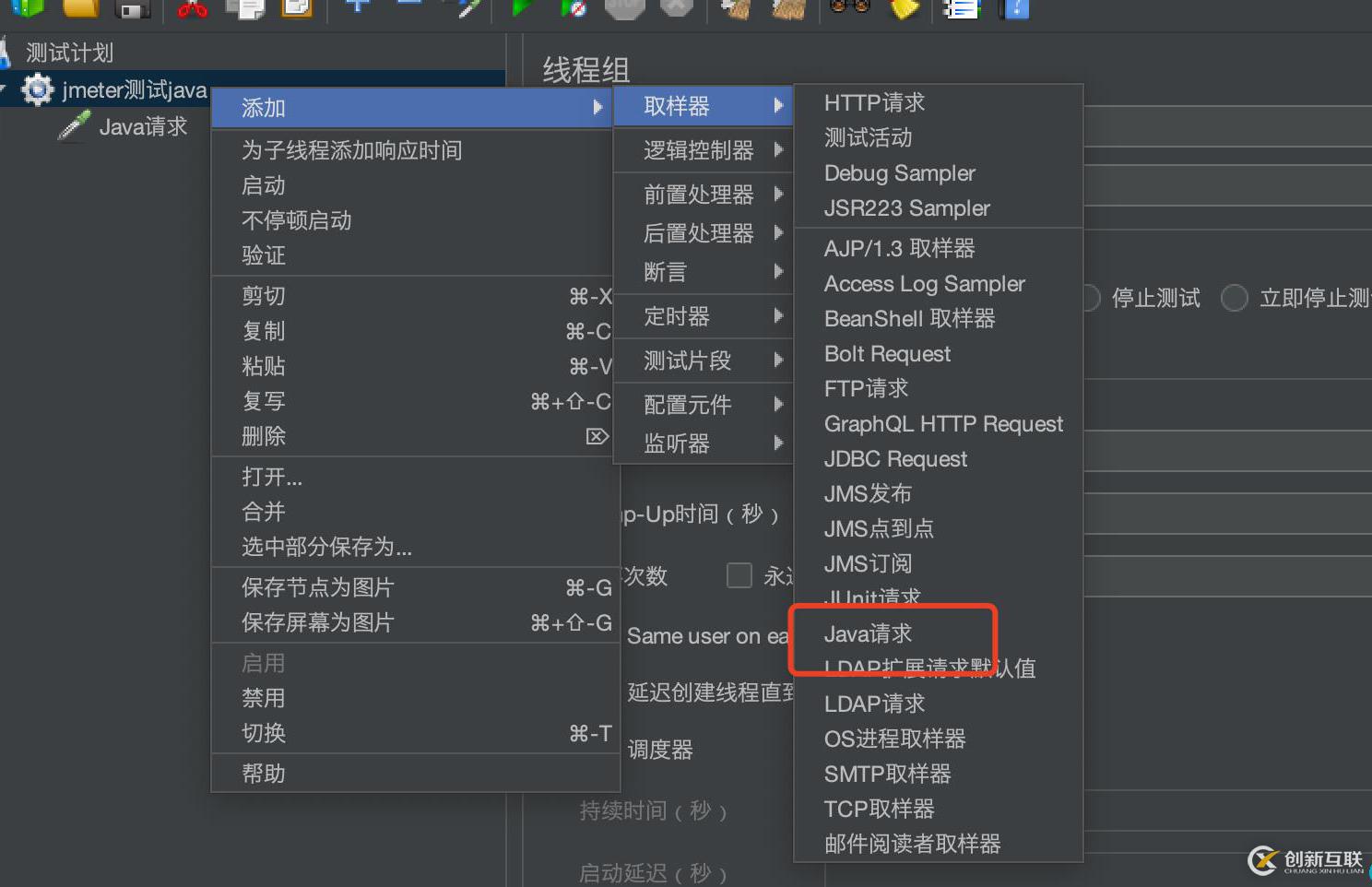 重啟jmeter。在線程組中,添加---取樣器--- java請求。