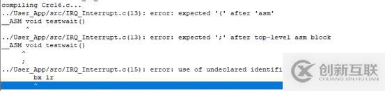 如果之前有使用了c和匯編混合代碼,在編譯器5可以正常通過,但是更改編譯器為V6.12后不識別__ASM關鍵字,并對匯編語法報錯,如下: