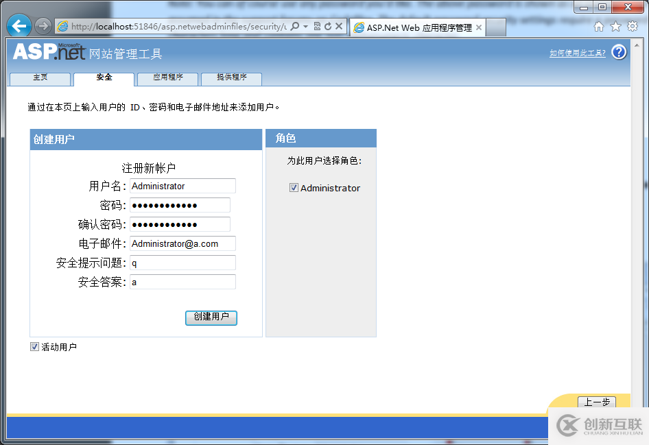 在我們授權(quán)訪問(wèn)網(wǎng)站之前,需要先創(chuàng)建一個(gè)管理員賬號(hào),最簡(jiǎn)單的方式就是使用內(nèi)建的 ASP.NET 站點(diǎn)管理工具創(chuàng)建。