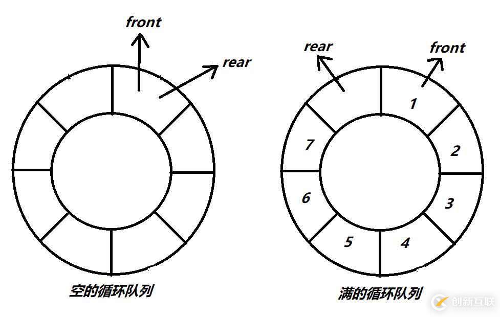 如下圖,當(dāng)rear=front便認(rèn)為是隊(duì)空,當(dāng)rear+1=front時認(rèn)為是隊(duì)滿。