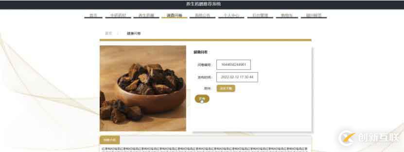 該部分內(nèi)容提供中藥藥材,養(yǎng)生藥膳,調(diào)查問卷,系統(tǒng)公告,個人中心,后臺管理,購物車,疑問解答等等。?