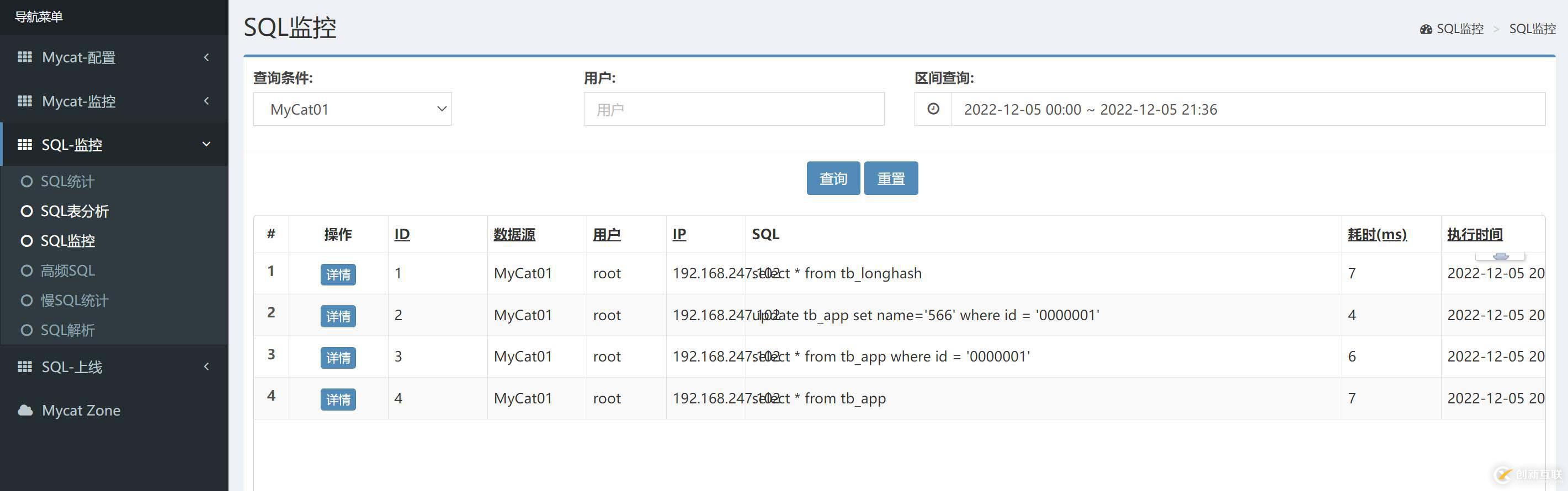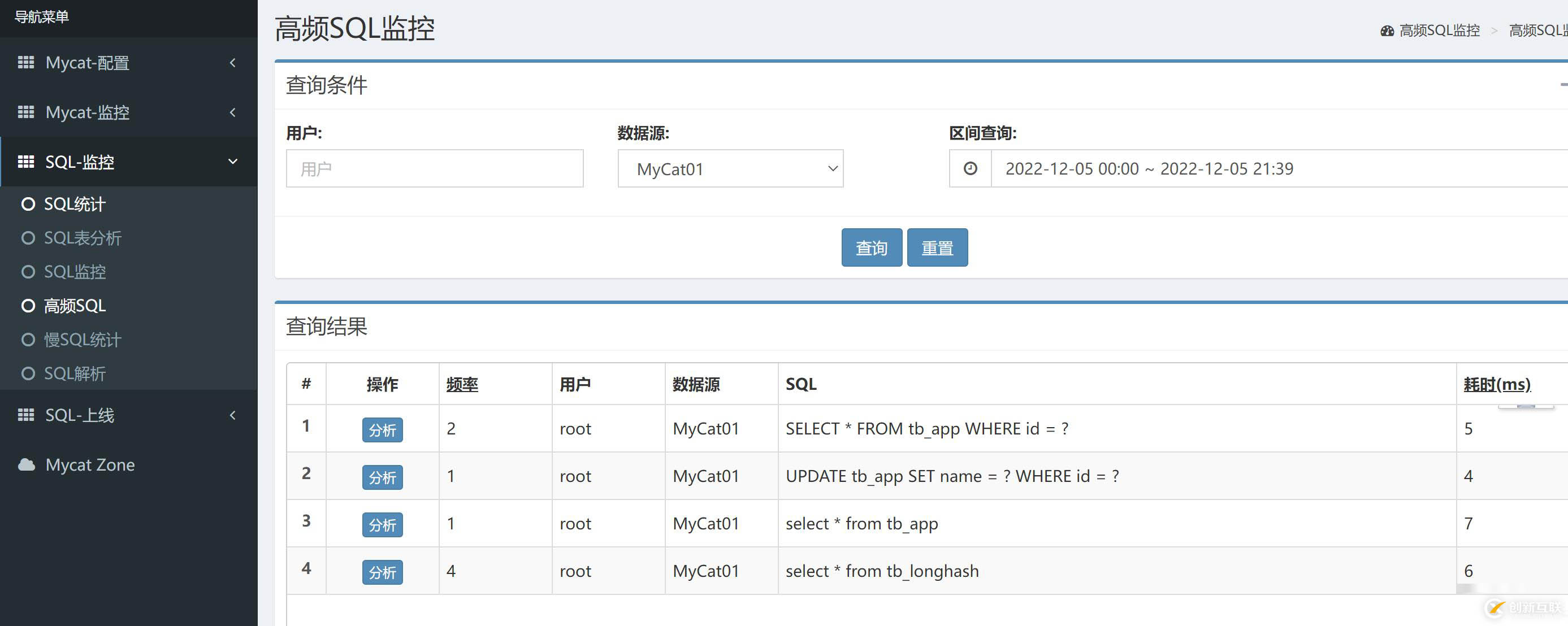 配置好了之后,我們可以通過MyCat執(zhí)行一系列的增刪改查的測試,然后過一段時(shí)間之后,打開mycat-eye的管理界面,查看mycat-eye監(jiān)控到的數(shù)據(jù)信息。