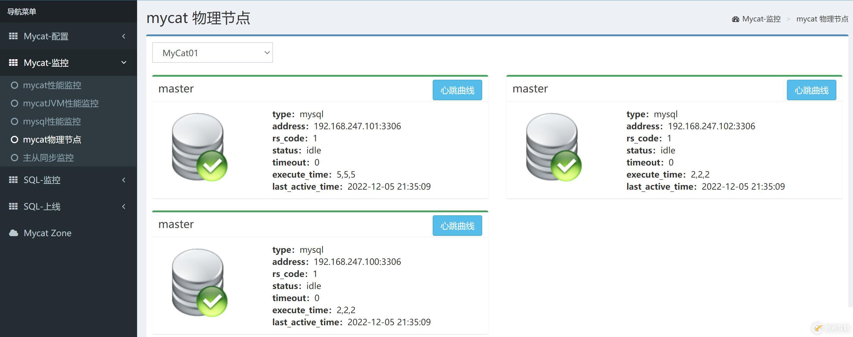 Mycat-web(Mycat-eye)是對mycat-server提供監(jiān)控服務(wù),功能不局限于對mycat-server使用。他通過JDBC連接對Mycat、Mysql監(jiān)控,監(jiān)控遠(yuǎn)程服務(wù)器(目前僅限于linux系統(tǒng))的cpu、內(nèi)存、網(wǎng)絡(luò)、磁盤。