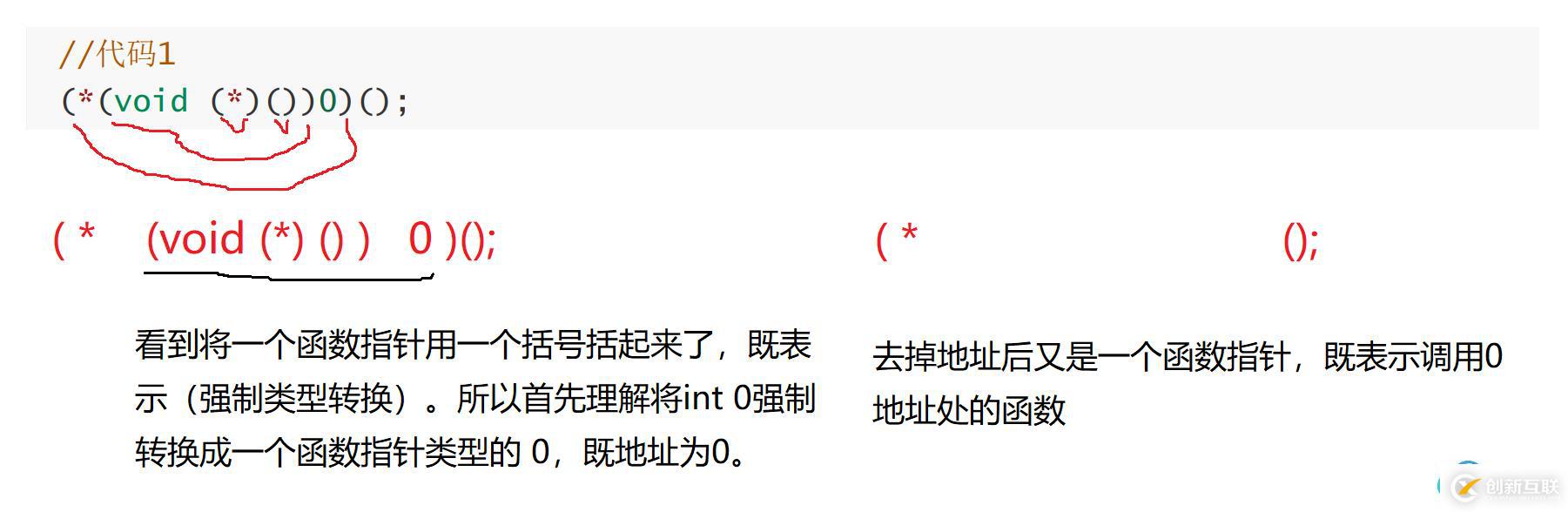 簡(jiǎn)述:將整形0強(qiáng)制 類型轉(zhuǎn)換成一個(gè)參數(shù)為無返回類型為void的函數(shù)指針地址,既0地址