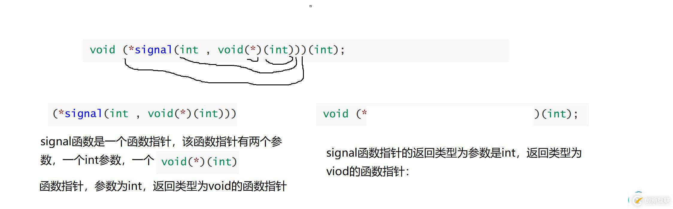 signal函數(shù)的參數(shù)有2個(gè),第一個(gè)是int。第二個(gè)是函數(shù)指針,該函數(shù)指針指向的函數(shù)的參數(shù)是int,返回類型是void
