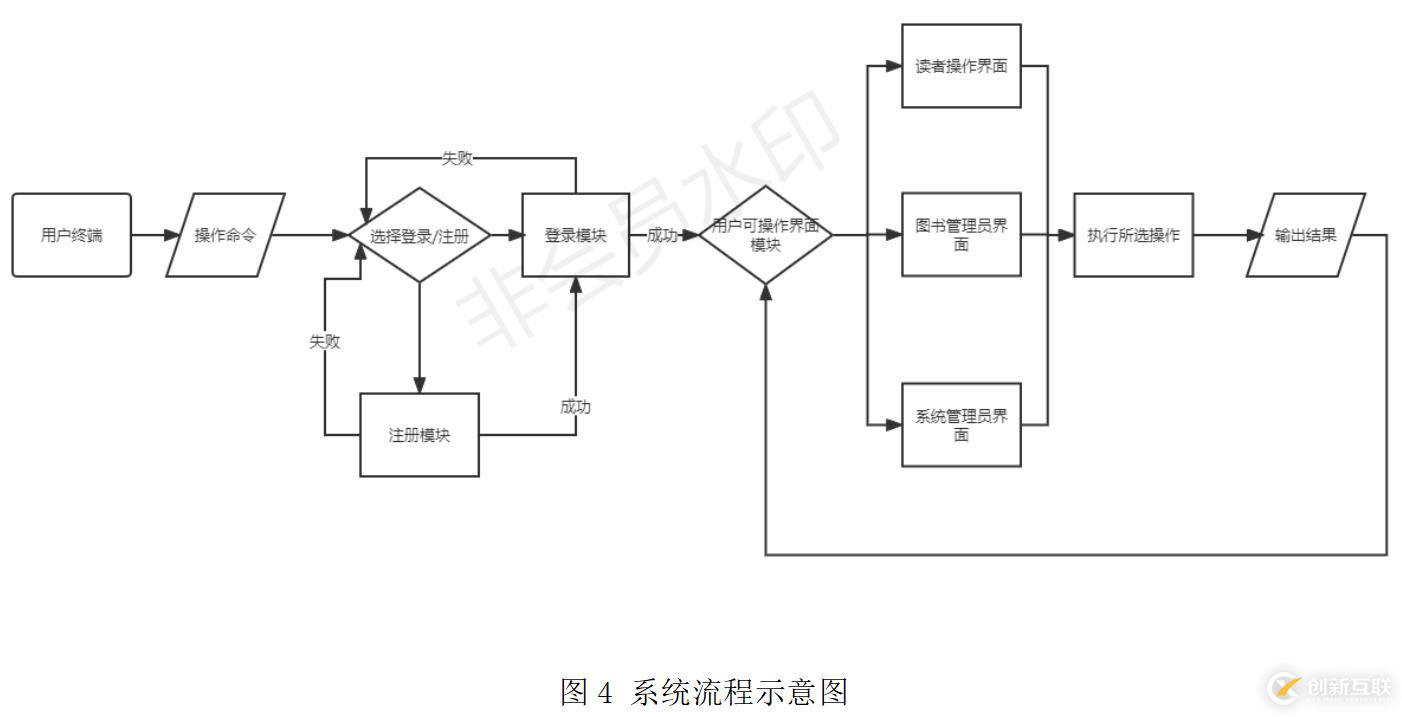 用戶先進(jìn)行選擇,經(jīng)過(guò)注冊(cè)后登錄系統(tǒng),或者使用已有賬號(hào)登錄系統(tǒng)。進(jìn)入用戶操作界面,普通讀者、圖書管理員、系統(tǒng)管理員有各自可以執(zhí)行的操作。選擇某個(gè)操作后,系統(tǒng)執(zhí)行并輸出結(jié)果到顯示器。系統(tǒng)流程圖如圖4: