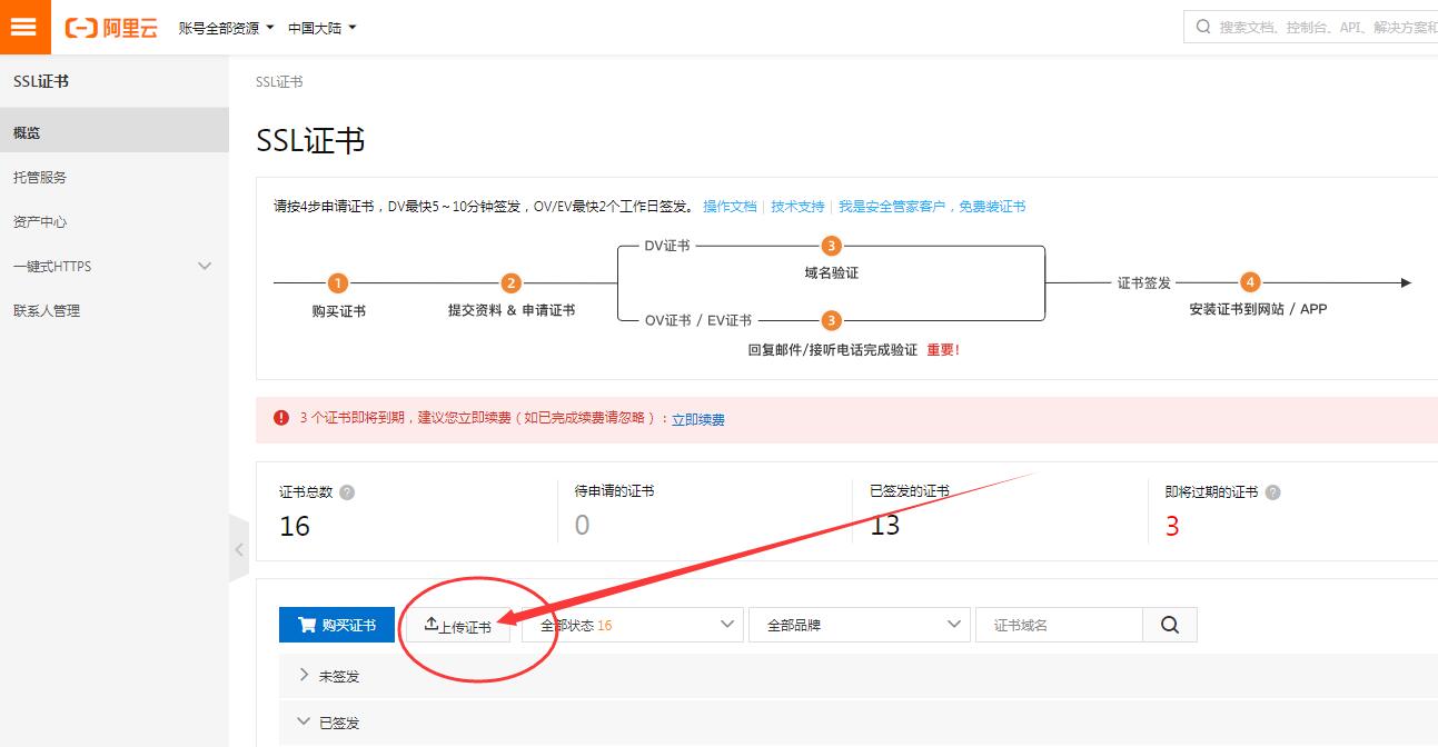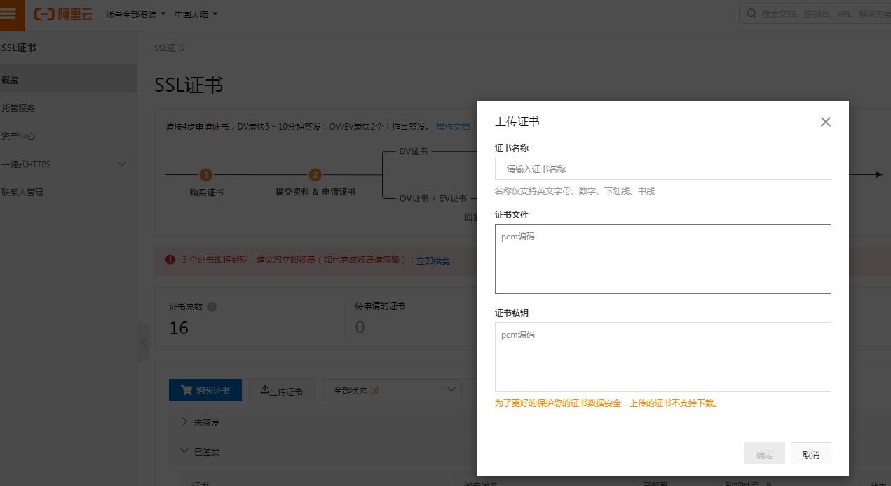 將SSL證書上傳阿里云SSL證書管理平臺統(tǒng)一管理