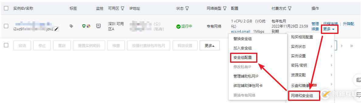 1.進(jìn)入云服務(wù)器ECS,選擇【實(shí)例】—【更多】—【問題和安全組】—【安全組配置】2.點(diǎn)擊安全組ID