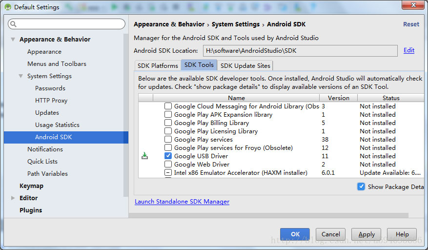 在“Default Settings”對話框選擇“Appearance & behavior”→“System Settings”→“Android SDK”,然后勾選“SDK Tools”的“Google USb Driver”,點擊“OK”,完成usb驅動的下載。