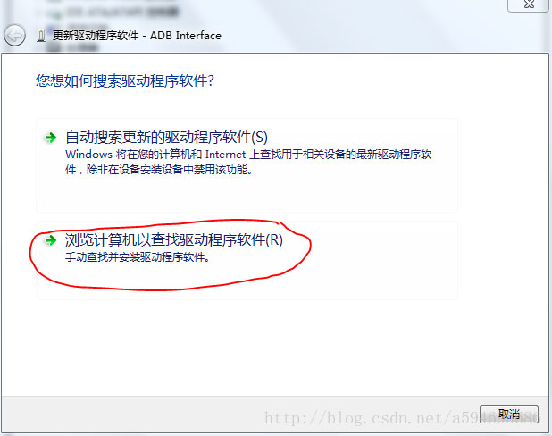 右鍵單擊設備管理器中帶感嘆號的“ADb Interface”,點擊右鍵菜單的“更新驅動程序軟件”,彈出“更新驅動程序軟件”對話框,如下圖所示: