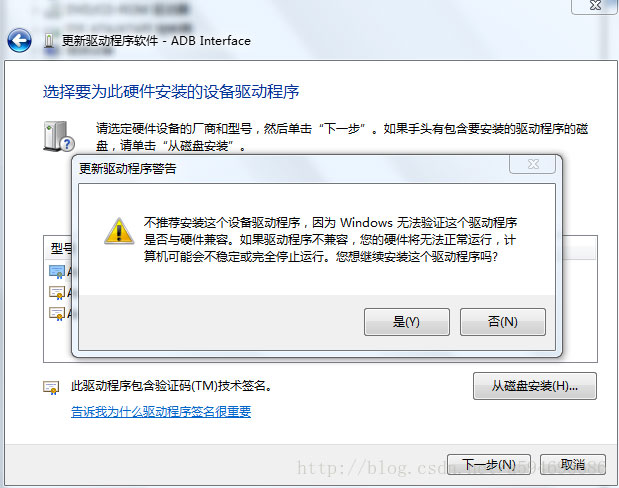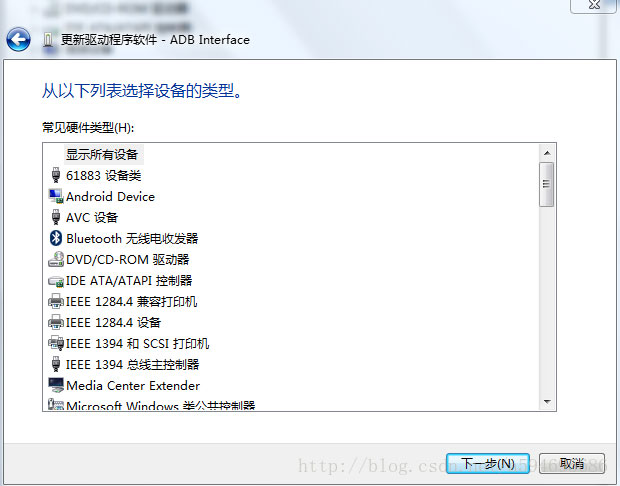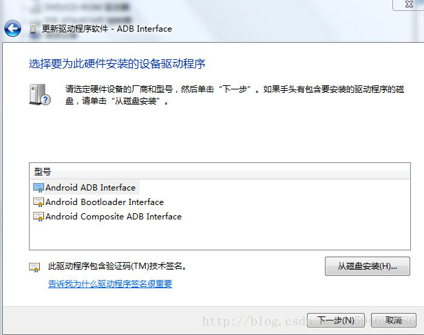 在這一步,在“型號”選擇“Android ADb Interface”,點擊“下一步”,如下圖。
