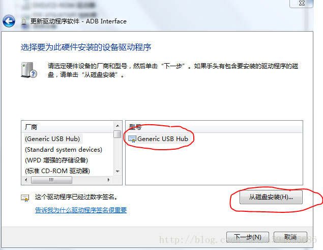 在這一步選擇“Generic USb Hub”,并單擊“從磁盤安裝…”,如下圖: