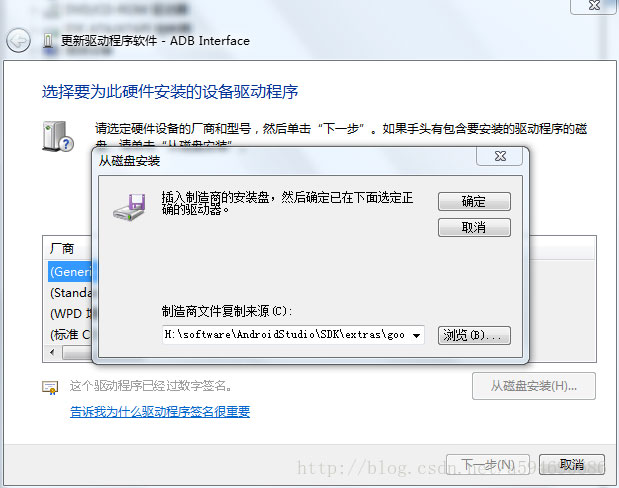 彈出“從磁盤安裝對話框”,在“制造商文件復制來源”路徑,選擇SDK下的“extras/google/usb_driver/android_winusb.inf”,點擊“確定”,如下圖: