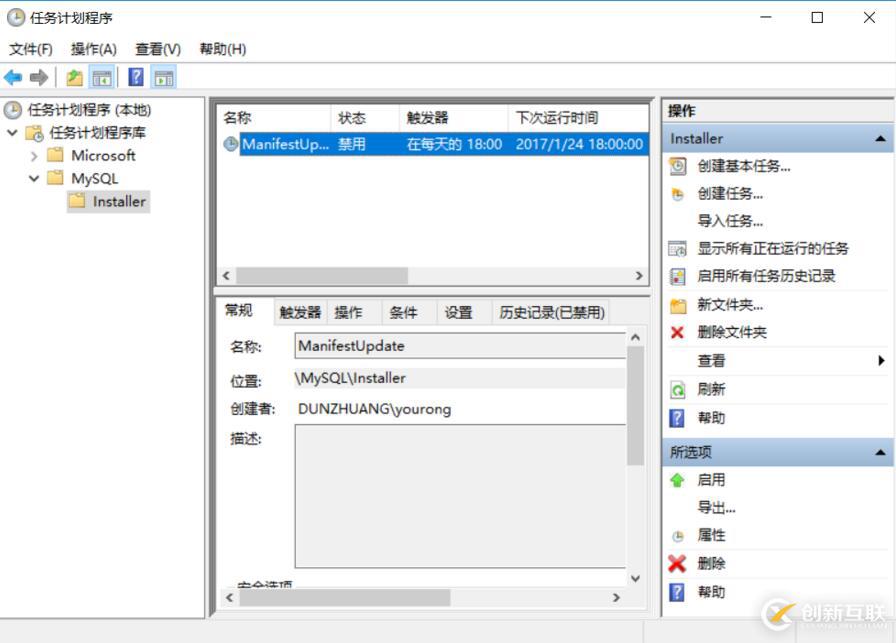 這貌似是一條安裝命令,Installing MYSQL 5.6.21 using MySQLInstallerConsole.exe 使用它可以設(shè)置一些下載安裝包,當(dāng)然使用的是默認(rèn)安裝不需人工干預(yù)。關(guān)掉它也沒(méi)有什么影響,win10狀態(tài)下,從開(kāi)始---->所有應(yīng)用----->管理工具----->任務(wù)計(jì)劃程序----》左側(cè)任務(wù)計(jì)劃程序庫(kù)文件夾,展開(kāi)文件夾----》mYsql子文件夾installer,點(diǎn)擊。在右側(cè)窗口右擊擊鼠標(biāo)禁用即可,見(jiàn)下圖。