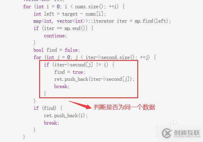首先,題目中要求不能使用同一個數(shù)據(jù)。所以,我們初始化map時,如果是相同的元素,還需要判斷元素所在數(shù)組序號。