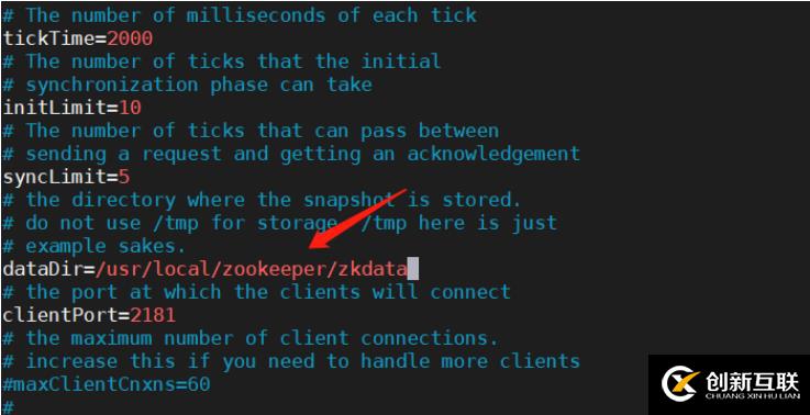 #切換至/usr/local/zookeeper/conf ?cd /conf ?#備份.cfg文件,并將原文件重命名為zoo.cfg ?cp zoo_sample.cfg zoo_sample.cfg.bak ?mv zoo_sample.cfg zoo.cfg ?#進(jìn)入配置文件,修改數(shù)據(jù)存儲(chǔ)目錄及日志保存目錄,如下圖所示的內(nèi)容,其他可保持默認(rèn) ?vim zoo.cfg