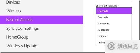 除了對(duì)以上內(nèi)容進(jìn)行設(shè)置外,還有一個(gè)容易忽略的內(nèi)容——消息提醒時(shí)長(zhǎng):過(guò)短的時(shí)間會(huì)在思考或發(fā)呆時(shí)忽略掉消息的提醒,太長(zhǎng)又會(huì)影響當(dāng)前屏幕的顯示內(nèi)容。在”超級(jí)按鈕”-“設(shè)置”-“更改電腦設(shè)置”-“輕松使用”-“顯示通知”的下拉菜單中可對(duì)通知時(shí)長(zhǎng)進(jìn)行設(shè)定,設(shè)定范圍可在5s-5min之間。