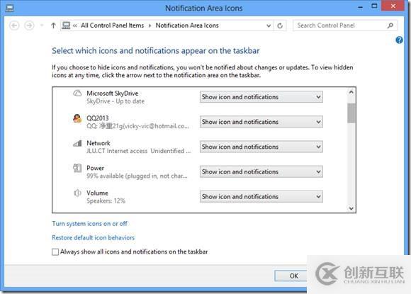 除了對(duì)應(yīng)用進(jìn)行設(shè)置以外,在桌面應(yīng)用下,傳統(tǒng)的通知區(qū)域設(shè)置并未取消。可以通過(guò)任務(wù)欄托盤的圖標(biāo)與通知進(jìn)行設(shè)定,顯示的圖標(biāo)將會(huì)在任務(wù)欄托盤中出現(xiàn)。