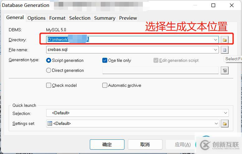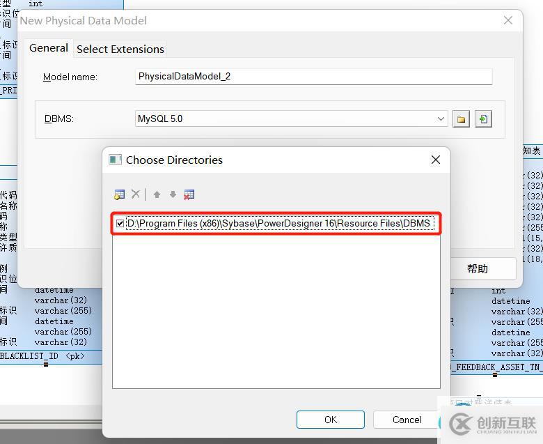 2、 DBMS選擇“MySQL5.0”,如果沒有選擇框擇選擇安裝目錄下"Sybasel\PowerDesigner 16\ Resource Files\DBMS"這個(gè)文件夾就有選擇框了。