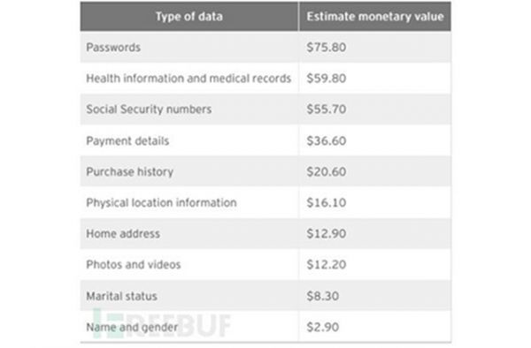 PII在地下市場(chǎng)確實(shí)有實(shí)際的貨幣價(jià)值,其中這些被盜信息的價(jià)格取決于它們對(duì)欺詐者的可用性,可用性越大,價(jià)值越高,反之亦然。通過(guò)對(duì)地下市場(chǎng)網(wǎng)絡(luò)犯罪數(shù)據(jù)的分析和研究,我們得出的被盜數(shù)據(jù)價(jià)值如下所示: