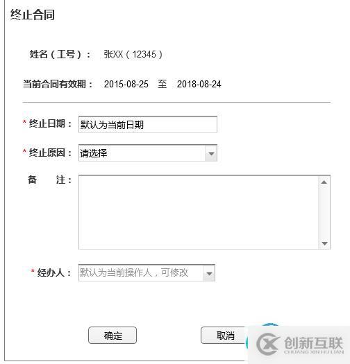 如果員工因?yàn)樽陨碓蚧蚱渌颍枰图瘓F(tuán)終止合同,可在履行中合同列表完成終止合同操作;點(diǎn)擊合同后的【終止】按鈕,打開“終止合同”窗口: