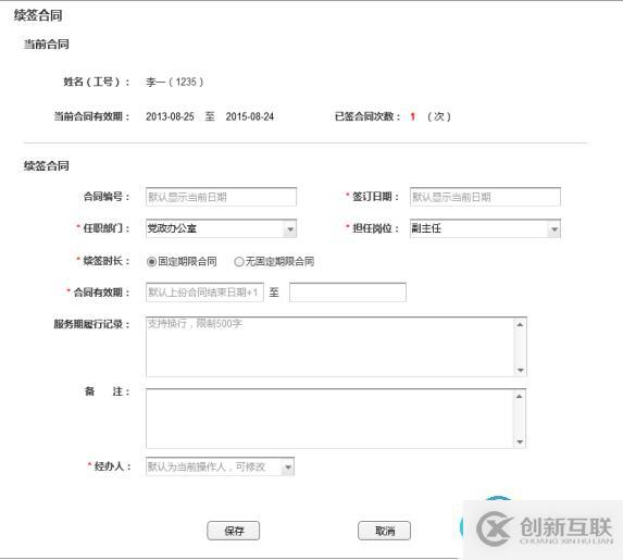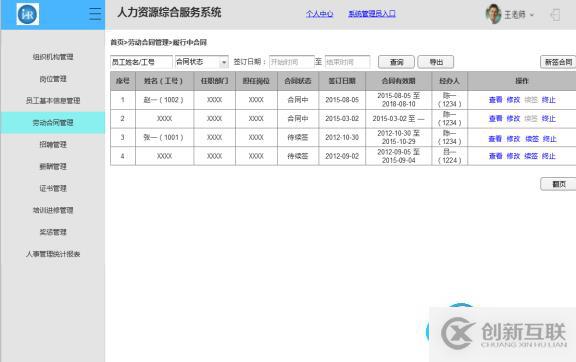 登錄系統(tǒng)后,人資管理員可以新簽合同,可以查看、修改合同信息,對于即將屆滿的合同可以進(jìn)行續(xù)簽,對于不符合集團(tuán)規(guī)定的員工,也可以終止合同。