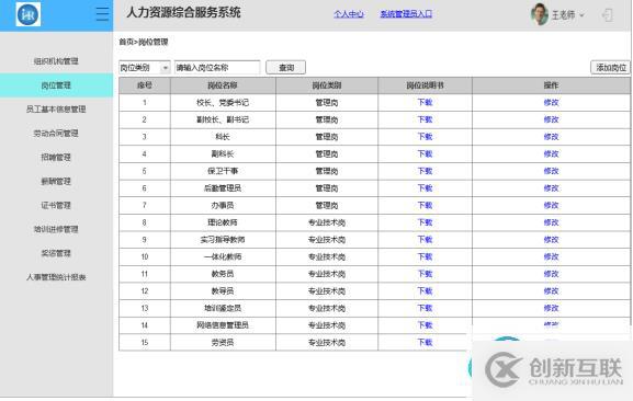 系統(tǒng)管理員按照“崗位類別>崗位名稱”的級聯(lián)關(guān)系對崗位進(jìn)行管理,主要包括添加崗位、修改崗位、下載崗位說明書、查詢的操作。