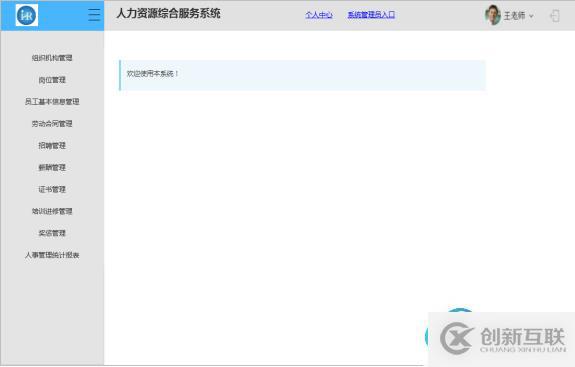 人資管理員登錄后,點(diǎn)擊頁面上方的“人資工作臺”,進(jìn)入人資工作臺首頁:首頁顯示系統(tǒng)歡迎語“歡迎使用本系統(tǒng)!”。
