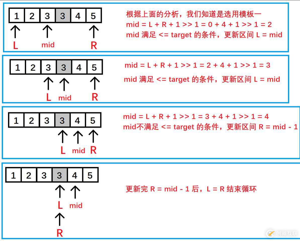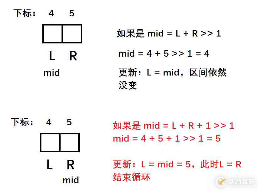 為什么mid =?L + R + 1 >>1???,這是由我們更新區(qū)間的方式?jīng)Q定了的,我們假設(shè)?L =?R - 1時(shí),如果按照?mid = L + R >>1?來算,那么 mid =?L +?L + 1 >>2 = L,我們發(fā)現(xiàn)?mid =?L,然后更新區(qū)間?L =?mid,即是?L =?L,區(qū)間并沒有變化,就會(huì)陷入死循環(huán)。由此,當(dāng)更新區(qū)間的方式為:L =?mid,R =?mid - 1 時(shí)計(jì)算 mid?的方式為:mid =?L +?R + 1 >>1。