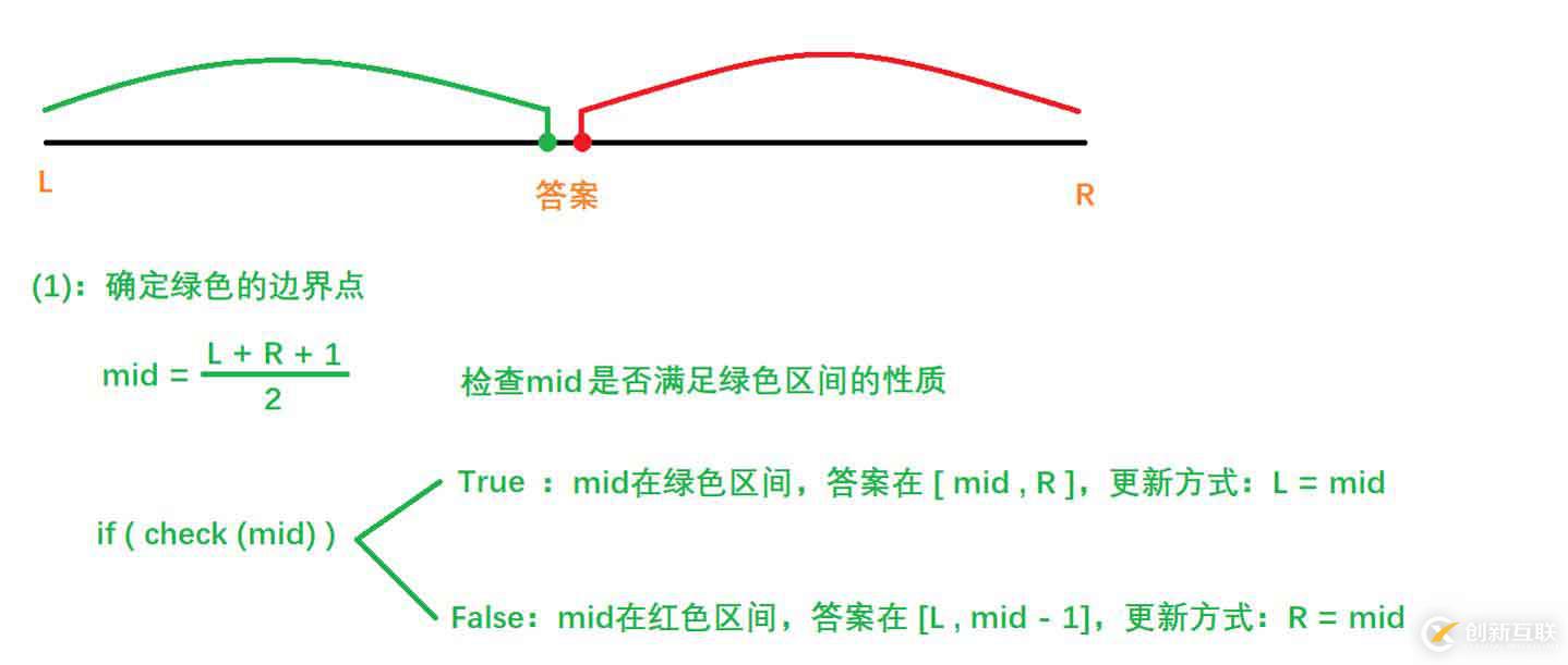 上圖中,假設(shè)我們要確定的是綠色的點(diǎn),在綠色區(qū)間的元素滿足一定的條件,紅色區(qū)間的元素也滿足一定的條件(這兩個(gè)區(qū)間的條件就是根據(jù)答案來確定的,后面有例題可以幫助大家理解),然后我們求出mid所在的區(qū)間,假設(shè)mid滿足綠色區(qū)間的條件,那么答案(要確定的綠色的點(diǎn))肯定在mid的右側(cè),并且mid也可能是答案,所以答案在 [ mid, R?],? 更新方式為:?L = mid;當(dāng)mid不滿足綠色區(qū)間的性質(zhì),那么mid就滿足紅色區(qū)間的性質(zhì),此時(shí)mid不可能是答案(要確定的綠色的點(diǎn)),所以答案就在 [ L, mid - 1 ]?的區(qū)間內(nèi),更新區(qū)間的方式:R =?mid - 1。