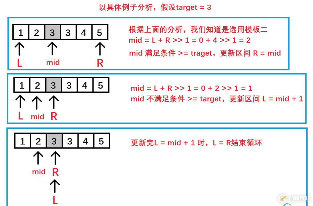 上圖中,假設(shè)我們要確定的是紅色的邊界點(diǎn),我們求出mid,檢查mid是否滿足紅色區(qū)間的條件,如果滿足,則mid在紅色區(qū)間,并且mid可能是答案,所以答案(要確定的紅色點(diǎn)的下標(biāo))?在 [L, mid ]區(qū)間內(nèi),更新方式?R =?mid,同理當(dāng)mid不滿足紅色區(qū)間的條件,答案就在 [ mid + 1, R?]?的區(qū)間內(nèi),更新區(qū)間的方式為:L =?mid + 1。